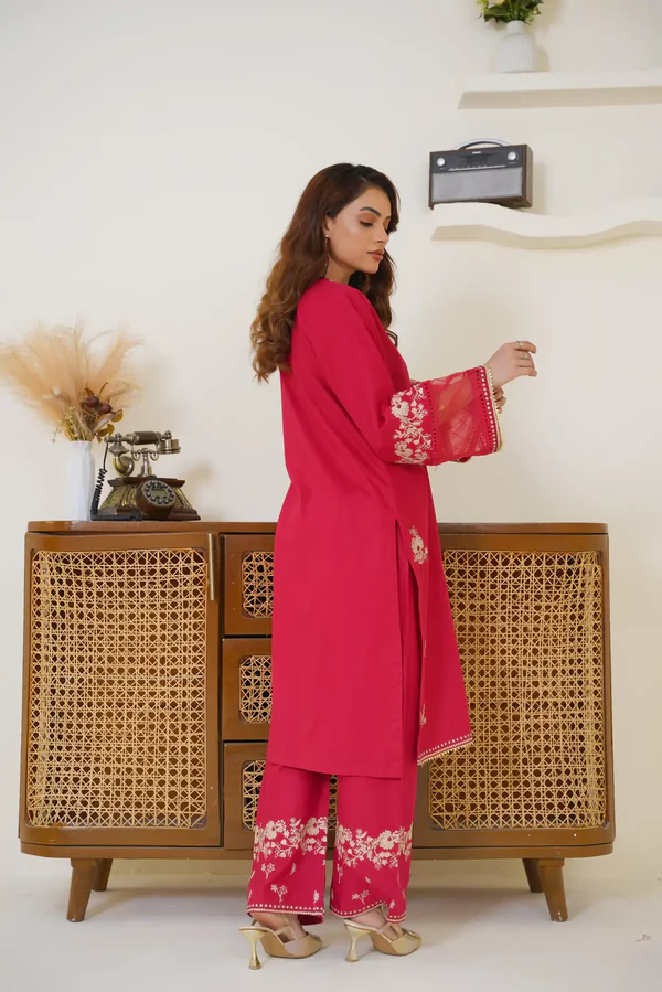 Strikingly designed, this 2Pc Summer Collection outfit features a straight long shirt cut from our Swiss Cambric series in the shades of Red Blood. Embellishments include a fully embroidered shirt with contrasting tishu patchwork, enhanced with fancy lace details at the hem.